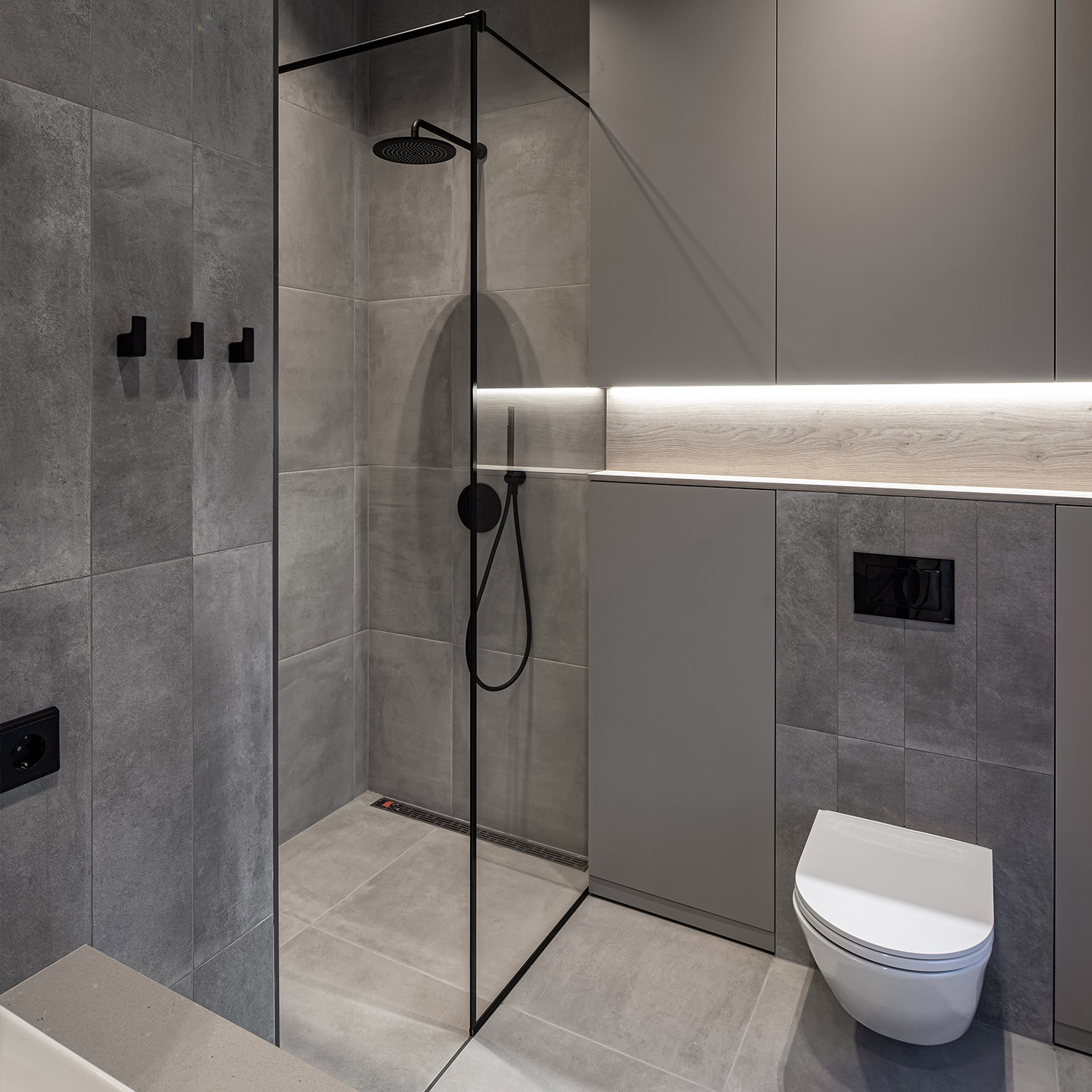 Light wall tiles contrast a dark tiled shower floor. Wall niche for space optimisation.