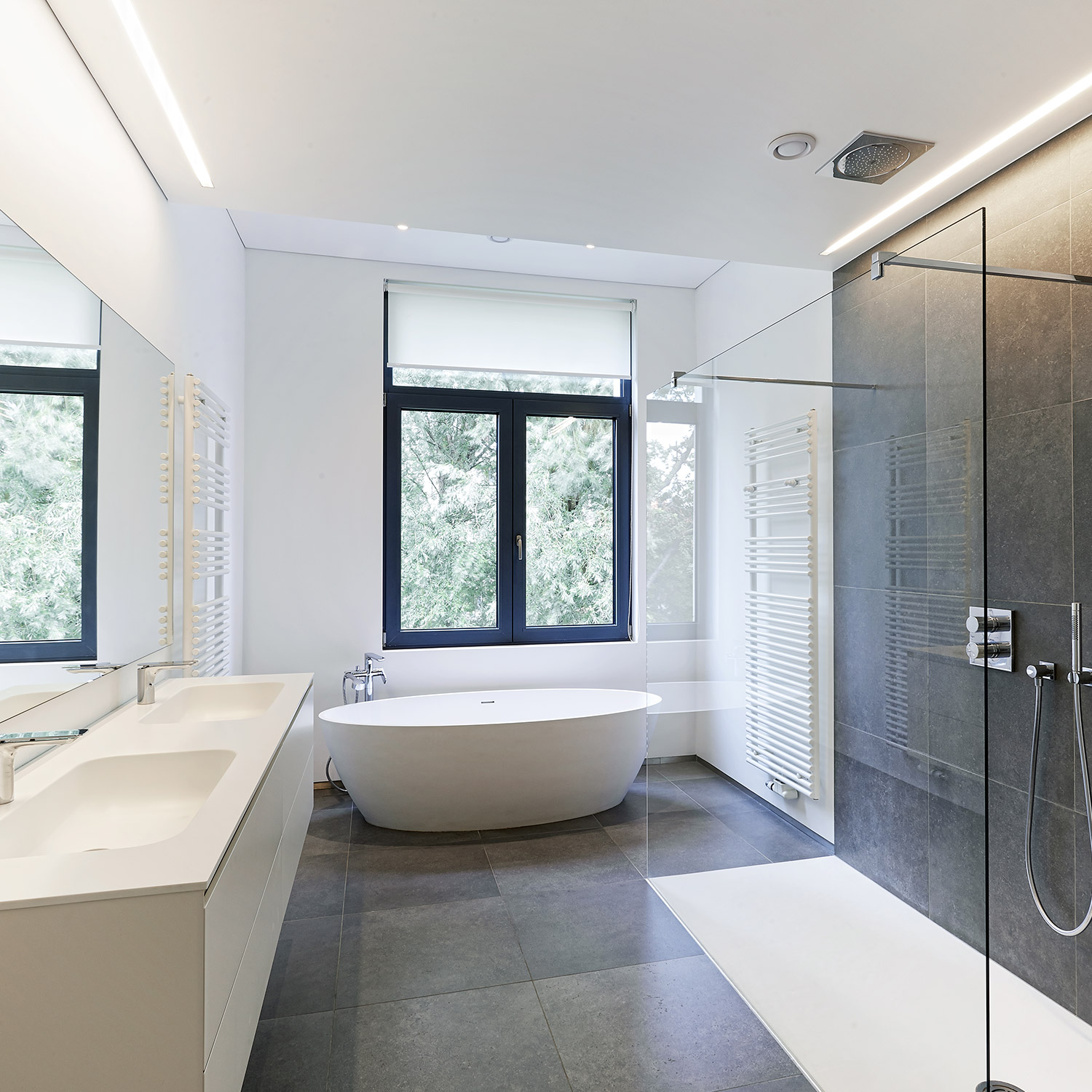 Oval tub, double vanity, walk-in shower with dark gray tiles, all bathed in natural light.