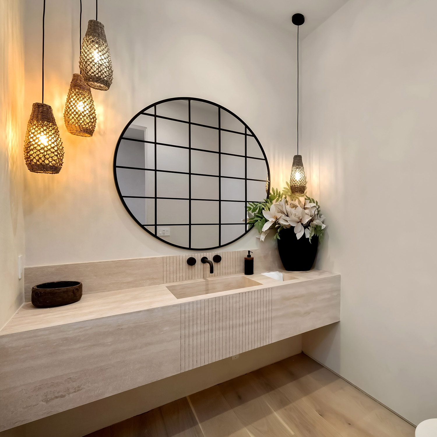 Round mirror frames a floating stone vanity with a rectangular sink. Warm pendant lighting.