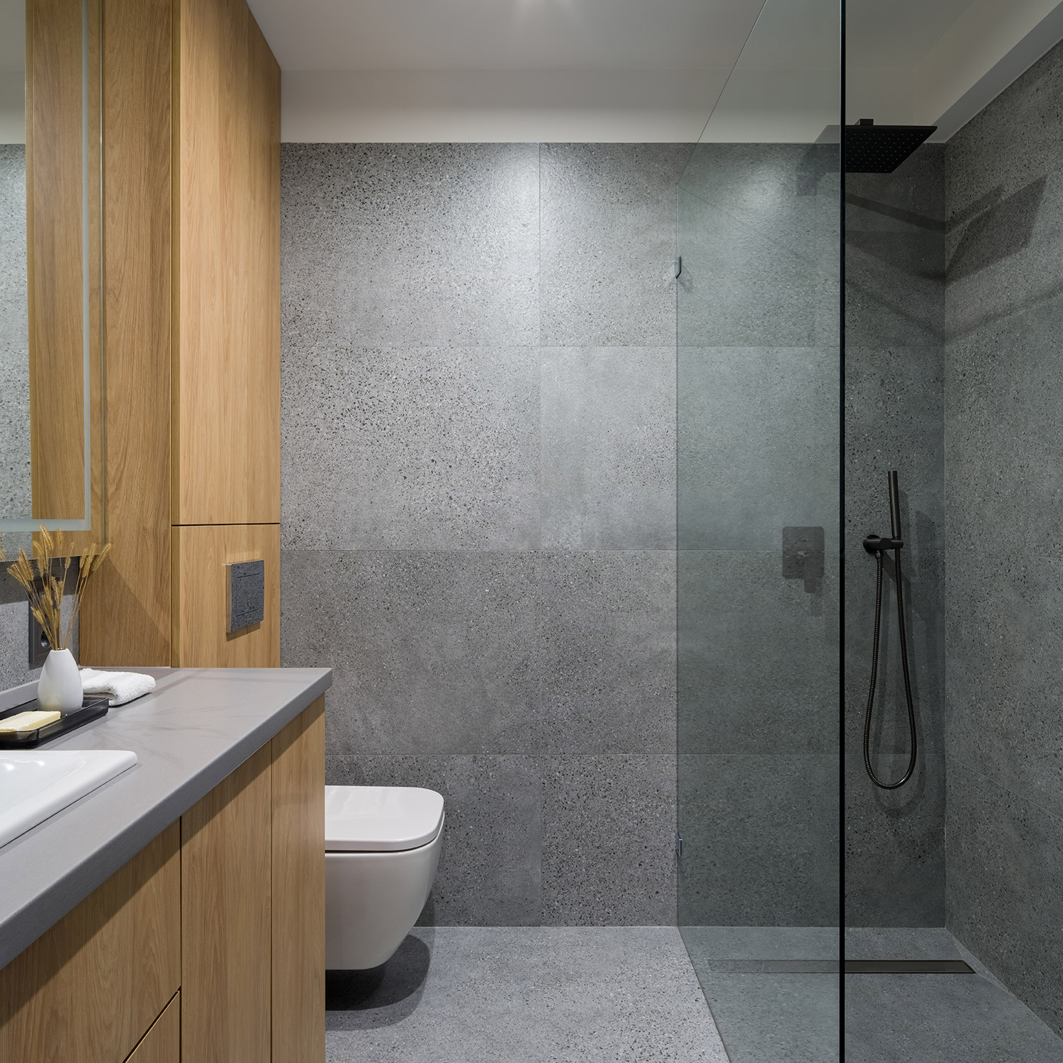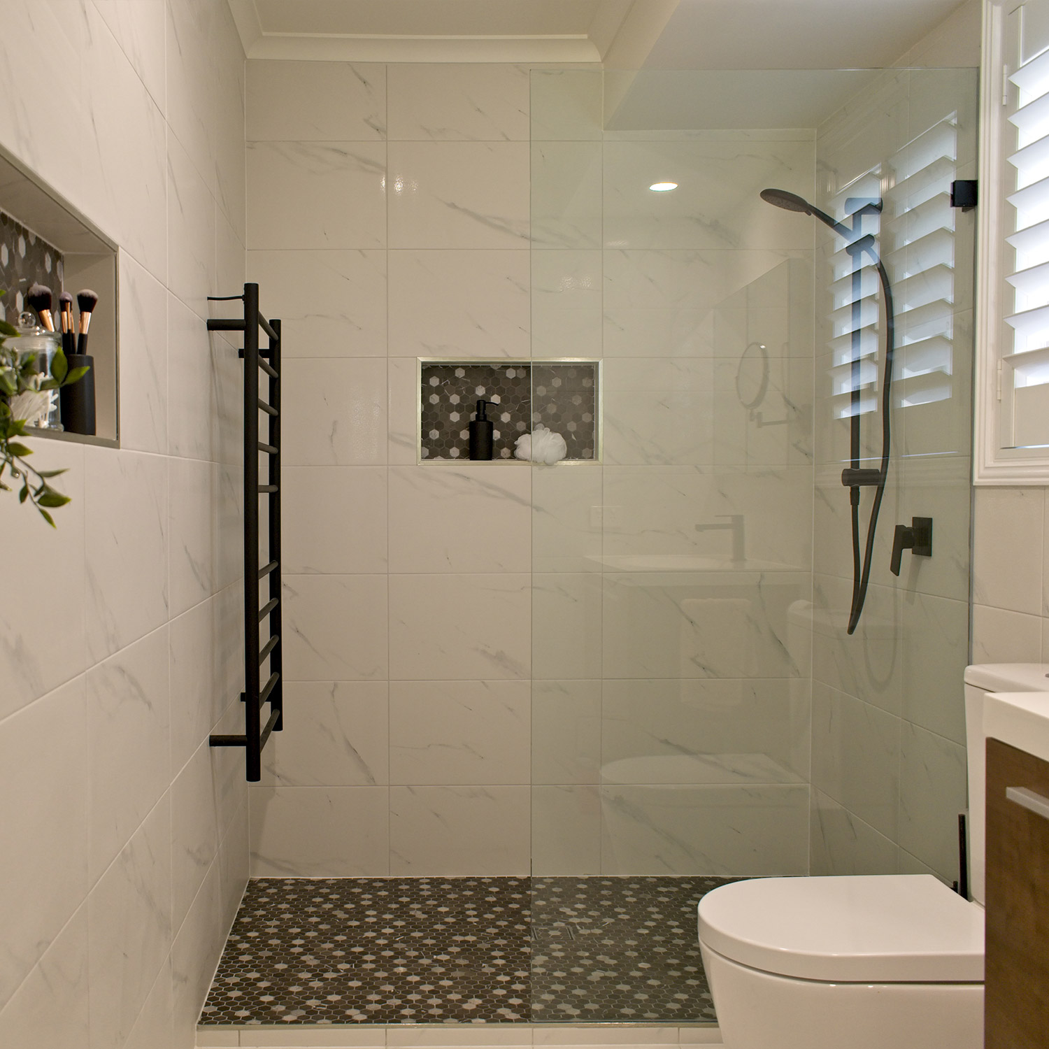 Light wall tiles contrast a dark tiled shower floor. Wall niche for space optimisation.